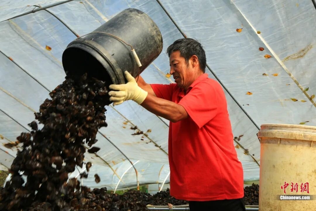 (菌農(nóng)將采摘下來(lái)的黑木耳倒出。黃松甸鎮(zhèn)供圖)
