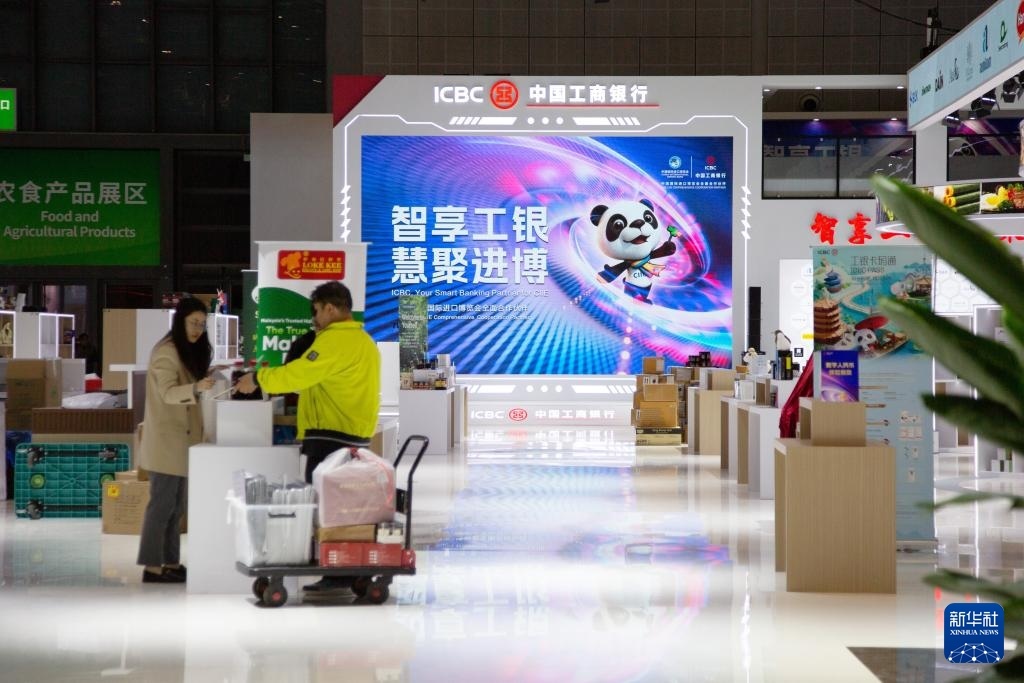 11月4日,工作人員在第八屆進博會農(nóng)食產(chǎn)品展區(qū)進行準備工作。