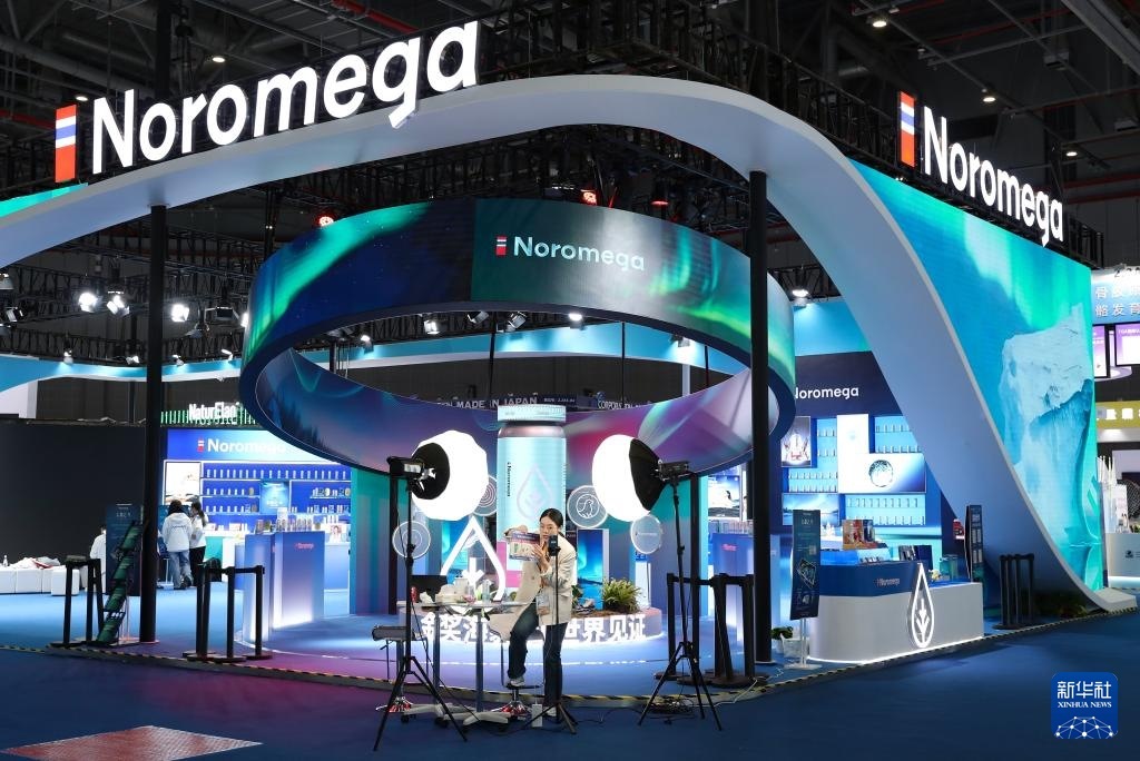 11月4日,工作人員在第八屆進博會的一個展位前錄制視頻。