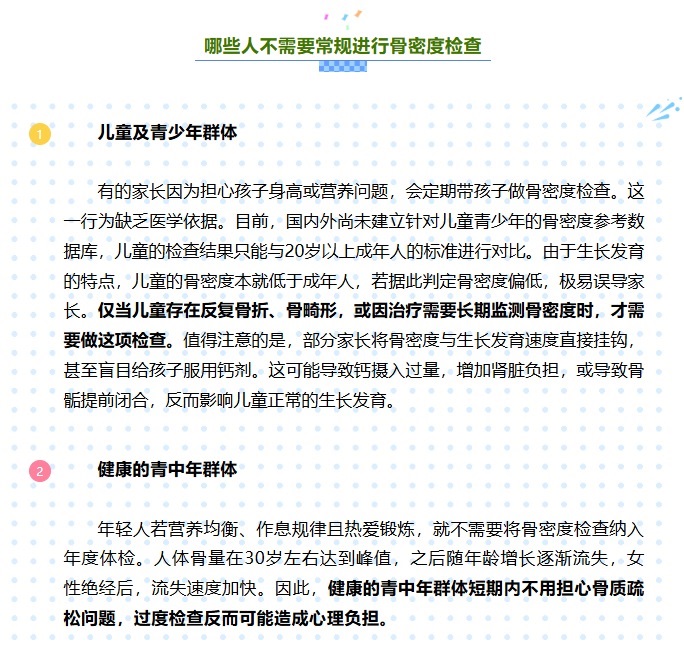 骨骼健康是人體健康的重要組成部分,其評估指標(biāo)不僅包括鈣含量,還涉及骨骼強(qiáng)度等多方面的因素,而骨密度在一定程度上,可以反映骨骼健康狀態(tài)。需要明確的是,并非人人都需要進(jìn)行骨密度檢查。而且,當(dāng)下流行的體脂秤及體檢中常用的超聲骨密度檢查,均不能作為診斷骨質(zhì)疏松癥的依據(jù)。正確認(rèn)識骨密度檢查的適用人群,既能避免醫(yī)療資源浪費(fèi),也能減少不必要的健康焦慮。