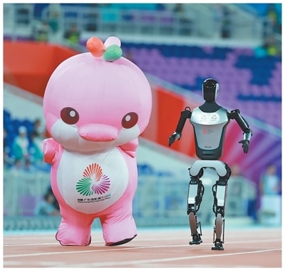 十五運會賽場,吉祥物與機器人互動。本報記者 陶相安攝