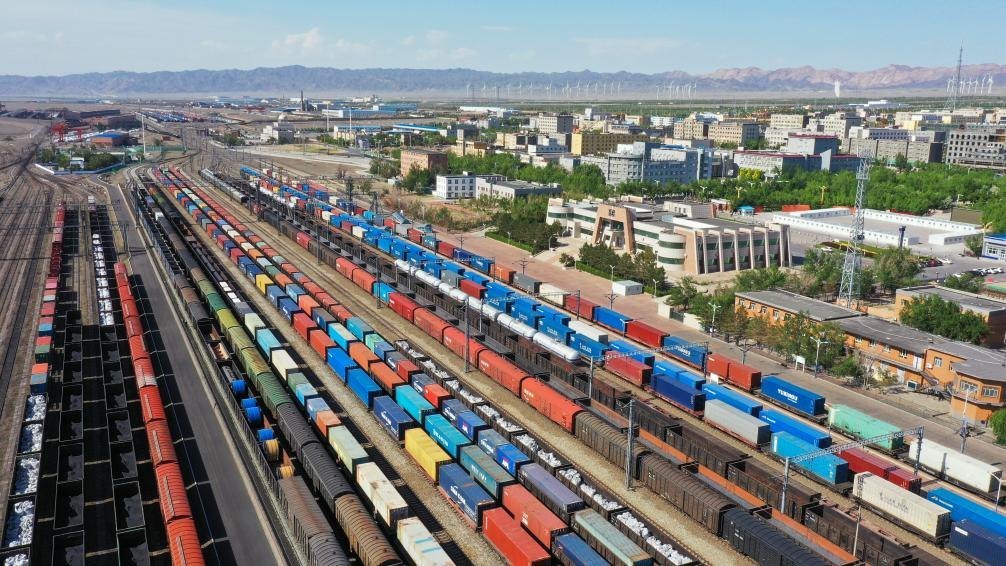 在新疆阿拉山口站寬準軌編組場,出入境中歐班列集結(jié)等待出發(fā)(2024年5月25日攝,無人機照片)。新華社發(fā)(于暉 攝)