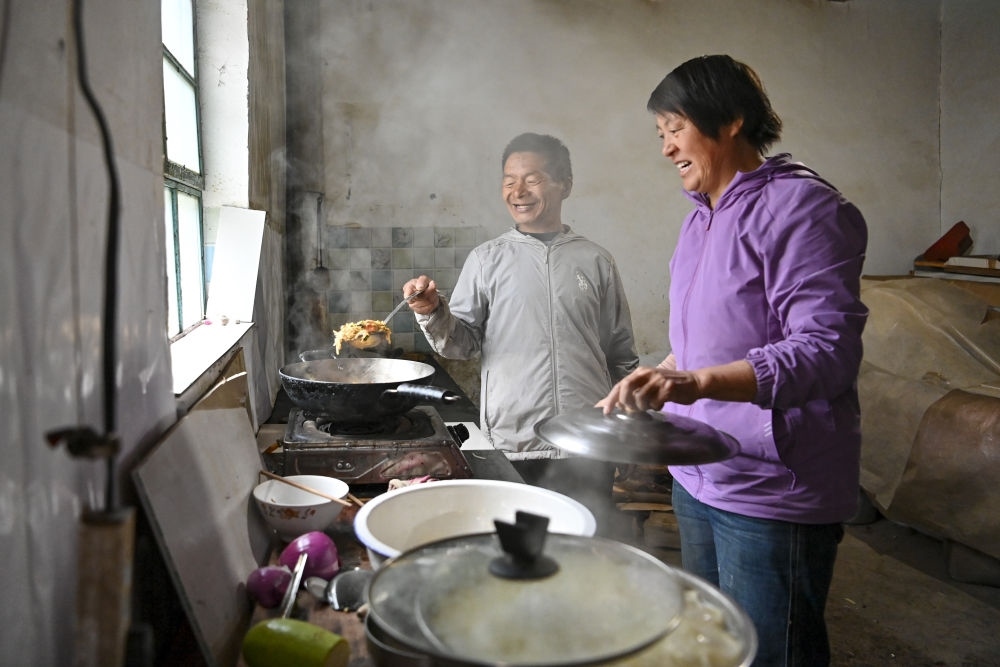 ↑村民程嬌梅(右)為秦海松準備午飯(2025年10月11日攝)。