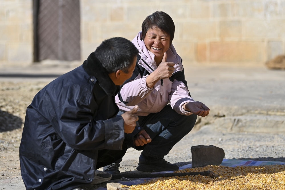 ↑村民程嬌梅(右)向幫忙撿玉米的秦海松表達感謝(2025年12月1日攝)。