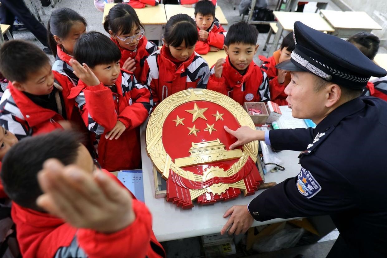 12月4日,民警在江蘇省泰州市海陵區(qū)九龍實(shí)驗(yàn)學(xué)校給學(xué)生講解憲法知識(shí)。當(dāng)?shù)?,通過(guò)咨詢(xún)、普法課堂等多種形式開(kāi)展憲法宣傳教育活動(dòng),弘揚(yáng)憲法精神,提升公民法治素養(yǎng)。(工人日?qǐng)?bào)通訊員 湯德宏 攝)