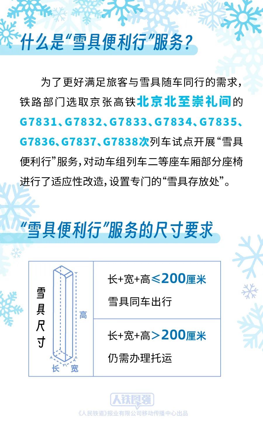 鐵路部門堅持以人民為中心的發(fā)展思想,持續(xù)深化運輸供給側(cè)結(jié)構(gòu)性改革,積極適應(yīng)旅客多樣化的出行需求,為攜帶雪具出行的旅客提供便捷服務(wù)。前期,鐵路部門按照《國鐵集團鐵路旅客運輸規(guī)程》“旅客乘坐動車組列車隨身攜帶的行李物品長、寬、高之和不超過130厘米”的規(guī)定,對超過上述尺寸標準的雪具推出了“雪具快運”服務(wù)。為了更好滿足旅客與雪具隨車同行的需求,鐵路部門統(tǒng)籌考慮旅客安全、乘車秩序和雪具運輸需求,選取京張高鐵北京北至崇禮間的G7831、G7832、G7833、G7834、G7835、G7836、G7837、G7838次列車試點開展“雪具便利行”服務(wù),對動車組列車二等座車廂部分座椅進行了適應(yīng)性改造,設(shè)置專門的“雪具存放處”,旅客選擇該服務(wù)后可攜帶長、寬、高之和不超過200厘米的雪具同車出行,滑雪更加方便快捷。對于長、寬、高之和超過200厘米的雪具,由于高鐵列車車內(nèi)空間限制,仍需辦理托運。