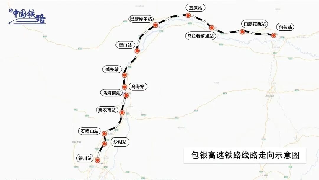 包銀高鐵起自包頭站,經(jīng)內(nèi)蒙古自治區(qū)包頭市、巴彥淖爾市、鄂爾多斯市、烏海市,寧夏回族自治區(qū)石嘴山市、銀川市,接入銀川站,正線全長(zhǎng)519公里,設(shè)計(jì)時(shí)速250公里,實(shí)行分段建設(shè),其中,惠農(nóng)至銀川段全長(zhǎng)97公里,已于2024年10月開通運(yùn)營(yíng),此次開通的包頭至惠農(nóng)段全長(zhǎng)422公里,共設(shè)10座車站。