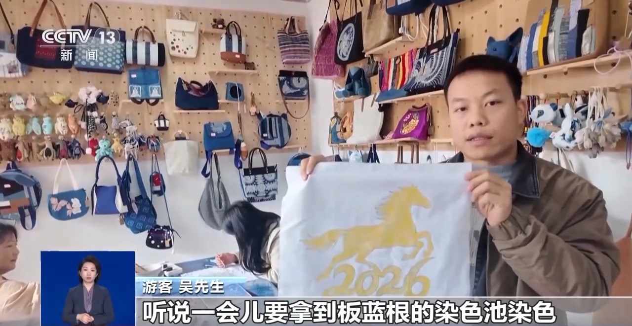 游客 吳先生:我畫的是一幅奔馬,聽說(shuō)一會(huì)兒要拿到板藍(lán)根的染色池染色,脫蠟以后做成方巾。明年是2026年,祝大家馬到成功。