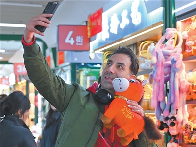 1月12日,在浙江義烏市國(guó)際商貿(mào)城一區(qū)玩具銷售區(qū),芬蘭外商與“哭哭馬”小馬公仔玩具合影。