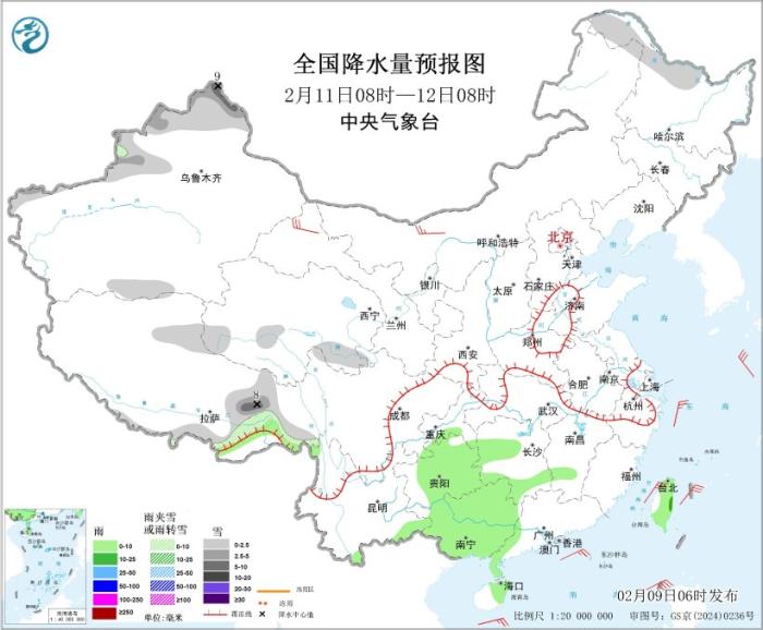 圖2 全國降水量預(yù)報(bào)圖(2月9日08時(shí)-10日08時(shí))圖片來源:中央氣象臺(tái)網(wǎng)站