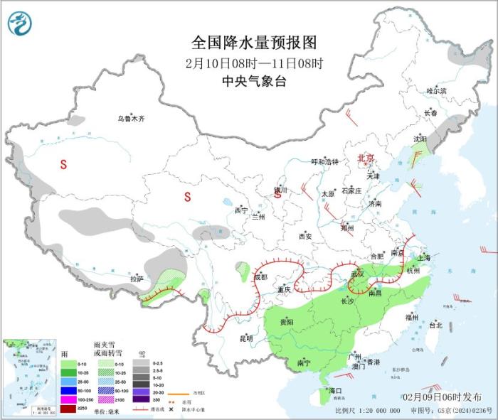 2月9日08時(shí)至10日08時(shí),新疆西北部、西藏東北部和南部、青海北部、甘肅河西、山西中南部、山東大部、湖北西部、湖南西北部、重慶東北部等地部分地區(qū)有小雪或雨夾雪,局地有中雪;貴州東北部、湖南西部等地高海拔山區(qū)有凍雨。江漢東部、江淮、江南及重慶東南部、貴州大部、廣西中部和北部、云南南部、海南島東部、臺(tái)灣島東部等地部分地區(qū)有小雨。新疆東部和南部、青海中東部、內(nèi)蒙古中西部、甘肅中西部、寧夏、陜西北部等地的部分地區(qū)有揚(yáng)沙或浮塵天氣,局地有沙塵暴。新疆北疆東部和南疆山區(qū)、內(nèi)蒙古西部、青海大部、甘肅河西、寧夏大部、西藏西部和北部、川西高原北部等地有5~7級(jí)風(fēng)、陣風(fēng)8~9級(jí);東海南部海域、臺(tái)灣海峽、臺(tái)灣以東洋面、巴士海峽、南海大部海域、瓊州海峽、北部灣將有7~8級(jí)、陣風(fēng)9級(jí)的大風(fēng),其中,巴士海峽、南海東部海域的部分海域風(fēng)力可達(dá)9級(jí)、陣風(fēng)10級(jí)(見圖2)。