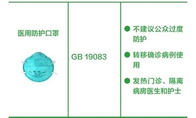 醫(yī)用防護(hù)口罩:推薦發(fā)熱門診、隔離病房醫(yī)護(hù)人員,以及確診新型冠狀病毒感染患者轉(zhuǎn)移使用。資源缺乏時(shí),不建議公眾過度防護(hù),可留給一線醫(yī)護(hù)人員使用。(橫列為口罩的圖片+名稱、產(chǎn)品標(biāo)準(zhǔn)、建議應(yīng)用場(chǎng)景。圖片來源:中國(guó)疾控中心)