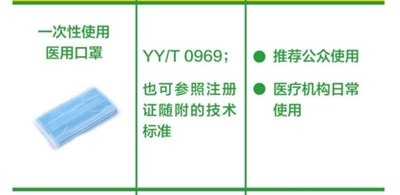 一次性使用醫(yī)用口罩:推薦公眾和醫(yī)療機(jī)構(gòu)的日常使用。(橫列為口罩的圖片+名稱、產(chǎn)品標(biāo)準(zhǔn)、建議應(yīng)用場(chǎng)景。圖片來源:中國(guó)疾控中心)