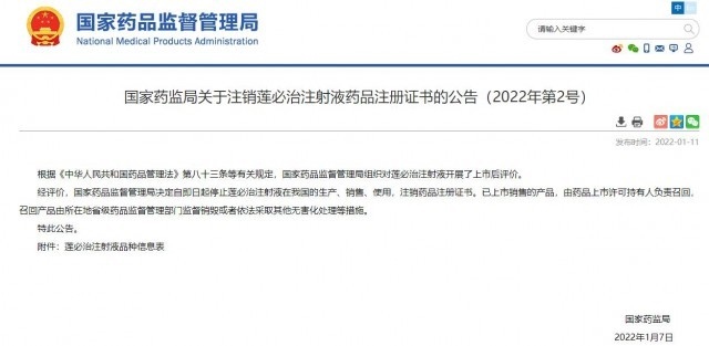 據(jù)國家藥監(jiān)局網(wǎng)站消息,國家藥品監(jiān)督管理局11日發(fā)布公告,決定自即日起停止蓮必治注射液在我國的生產(chǎn)、銷售、使用,注銷藥品注冊證書。已上市銷售的產(chǎn)品,由藥品上市許可持有人負責(zé)召回,召回產(chǎn)品由所在地省級藥品監(jiān)督管理部門監(jiān)督銷毀或者依法采取其他無害化處理等措施。