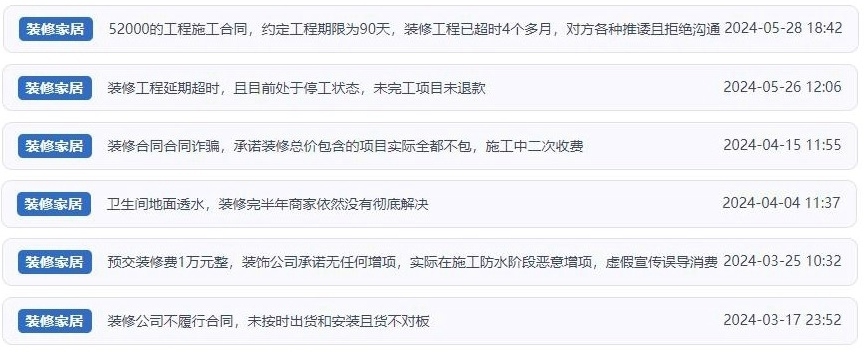 其實(shí),有著同樣遭遇的消費(fèi)者不在少數(shù)。公開(kāi)報(bào)道顯示,今年以來(lái)有多個(gè)家裝機(jī)構(gòu)分公司或經(jīng)銷商跑路,還有個(gè)別不良裝修公司在短時(shí)間內(nèi)聚收大量預(yù)付款后攜款跑路,給消費(fèi)者帶來(lái)經(jīng)濟(jì)財(cái)產(chǎn)損失。“人民投訴”梳理發(fā)現(xiàn),除閉店跑路外,目前平臺(tái)上涉及家裝消費(fèi)類的投訴問(wèn)題多聚焦于——