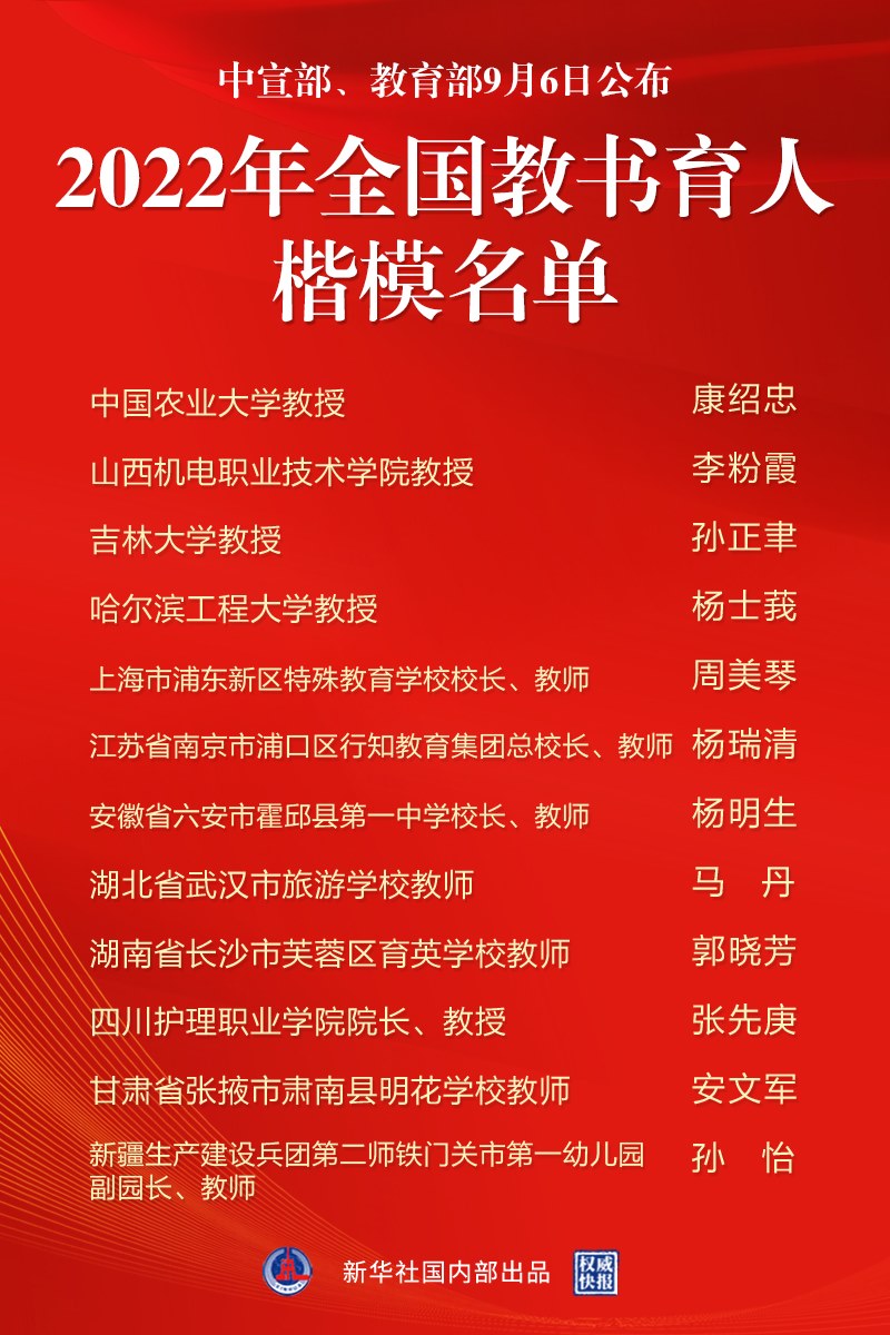 這12位全國(guó)教書(shū)育人楷模,有的深耕思政課堂、傳播黨的創(chuàng)新理論,有的勇攀科研高峰、取得顯著成果,有的一輩子扎根基層、矢志奉獻(xiàn)山區(qū)教育,有的創(chuàng)新思路方法、為孩子傾注大愛(ài)深情,充分展示了新時(shí)代教師隊(duì)伍有理想信念、有道德情操、有扎實(shí)學(xué)識(shí)、有仁愛(ài)之心的良好精神風(fēng)貌,是廣大人民教師的優(yōu)秀代表和杰出典范。他們是:中國(guó)農(nóng)業(yè)大學(xué)教授康紹忠,山西機(jī)電職業(yè)技術(shù)學(xué)院教授李粉霞,吉林大學(xué)教授孫正聿,哈爾濱工程大學(xué)教授楊士莪,上海市浦東新區(qū)特殊教育學(xué)校校長(zhǎng)、教師周美琴,江蘇省南京市浦口區(qū)行知教育集團(tuán)總校長(zhǎng)、教師楊瑞清,安徽省六安市霍邱縣第一中學(xué)校長(zhǎng)、教師楊明生,湖北省武漢市旅游學(xué)校教師馬丹,湖南省長(zhǎng)沙市芙蓉區(qū)育英學(xué)校教師郭曉芳,四川護(hù)理職業(yè)學(xué)院院長(zhǎng)、教授張先庚,甘肅省張掖市肅南縣明花學(xué)校教師安文軍,新疆生產(chǎn)建設(shè)兵團(tuán)第二師鐵門(mén)關(guān)市第一幼兒園副園長(zhǎng)、教師孫怡。