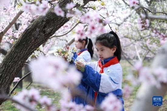 3月28日,內(nèi)丘縣大都城小學(xué)學(xué)生在梨園疏花。