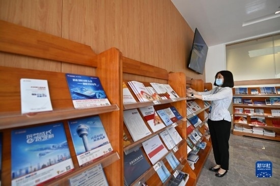 5月18日,工作人員在天開高教科創(chuàng)園內(nèi)的“金融超市”整理宣傳冊。