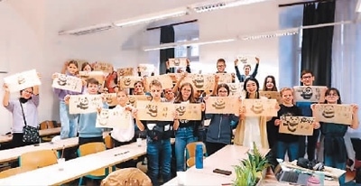 匈牙利羅蘭大學(xué)孔子學(xué)院下設(shè)埃格爾教學(xué)點(diǎn)多博·伊什特萬中學(xué)中文課堂的學(xué)生們展示繪畫作品。