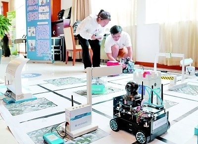 上海電子信息職業(yè)技術(shù)學(xué)院的師生展示智能機器人創(chuàng)新開發(fā)項目。 新華社發(fā)