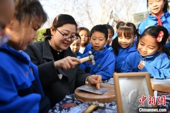 3月11日,河北省級非物質文化遺產項目“郭氏鐵板浮雕”傳承人郭墨涵(黑衣)為學生展示技藝。中新網(wǎng)記者 翟羽佳 攝