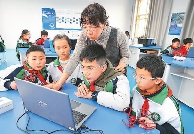 江西省上饒市廣豐區(qū)洋口中心小學(xué)人工智能教室里,學(xué)生們?cè)诶蠋煹闹笇?dǎo)下開(kāi)展人工智能科普課程。朱文標(biāo)攝(人民圖片)
