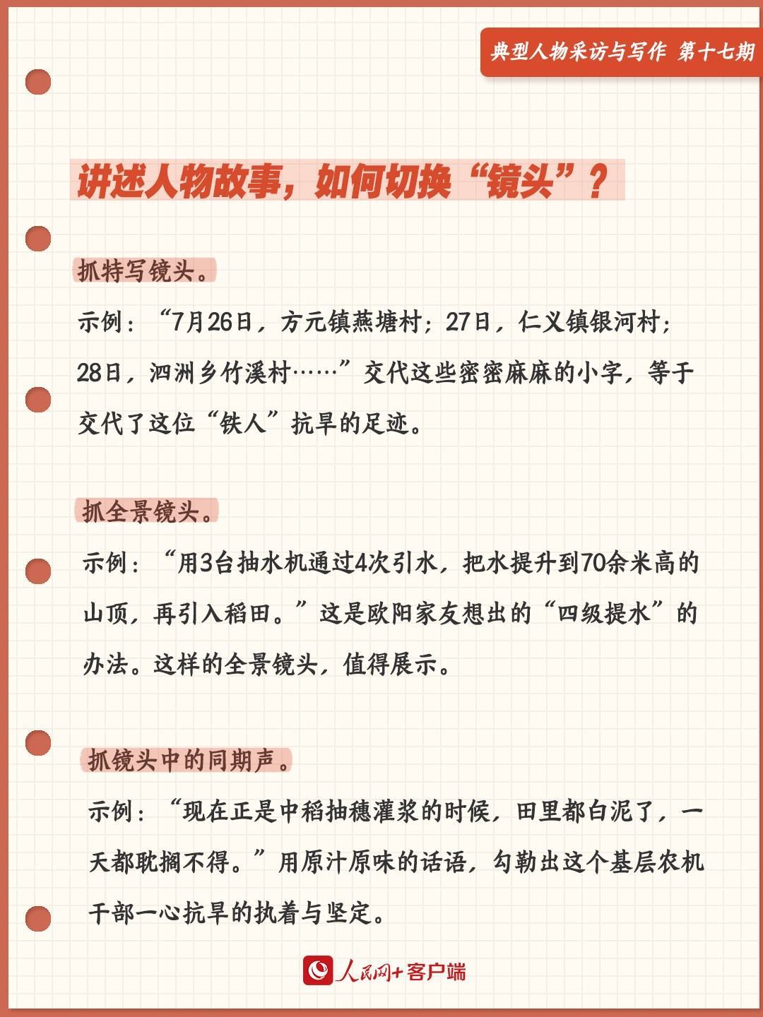 歐陽家友家中的日歷,其實就是他的抗旱工作表。“7月26日,方元鎮(zhèn)燕塘村;27日,仁義鎮(zhèn)銀河村;28日,泗洲鄉(xiāng)竹溪村……”交代這些密密麻麻的小字,等于交代了這位“鐵人”抗旱的足跡。這樣的特寫鏡頭,不應(yīng)錯過。