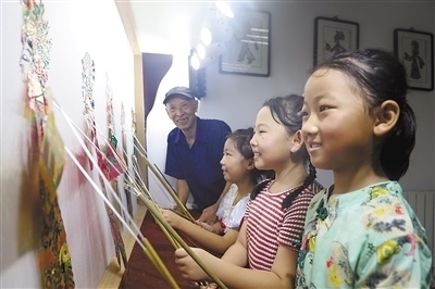 非遺體驗河北省唐山市豐潤區(qū)浭陽街道華府社區(qū)開設“非遺”小課堂,小朋友們在學習表演皮影戲。 朱大勇攝(人民視覺)