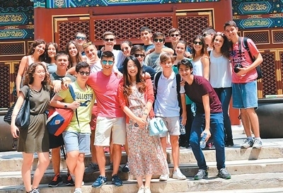 | 孫曉宇(前排左四)帶著意大利羅馬國(guó)立住讀學(xué)校學(xué)生在北京參加夏令營(yíng)。 |