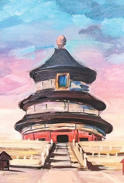 夕陽余暉中,新西蘭華裔青少年們在天壇祈年殿紅墻邊席地而坐,揮動畫筆,捕捉眼前美景?!跋﹃栂缕砟甑罡@壯麗,我希望通過我的畫筆展現(xiàn)出它的雄偉?!眳⒃L團學生秦曉寓說。