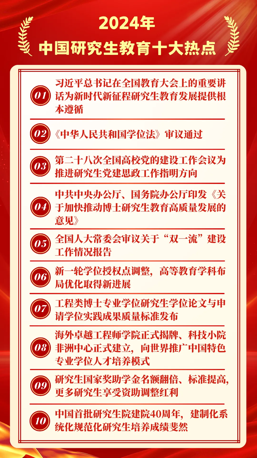 2024年,是中國學(xué)位與研究生教育發(fā)展史上具有重要里程碑意義的一年,在教育部學(xué)位管理與研究生教育司指導(dǎo)下,教育部學(xué)位與研究生教育發(fā)展中心《中國研究生》雜志回顧總結(jié)全年研究生教育大事要事和熱點(diǎn)動態(tài),聯(lián)合人民網(wǎng)、新華網(wǎng)、中國教育報(bào)和有關(guān)研究生教育媒體等共同發(fā)布2024年中國研究生教育十大熱點(diǎn)。