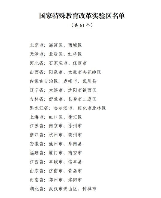 記者2月10日從教育部獲悉,經(jīng)各地自主申報、省級推薦、網(wǎng)絡公示等環(huán)節(jié),認定北京市海淀區(qū)等61個國家特殊教育改革實驗區(qū)。