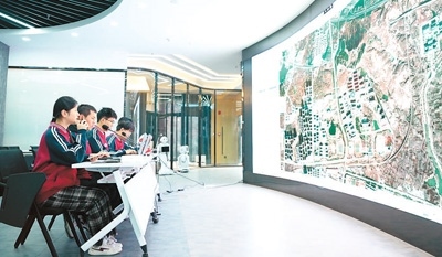 學(xué)生在學(xué)校低空空域管控服務(wù)中心進行無人機飛行作業(yè)的航線規(guī)劃、飛行任務(wù)管理。