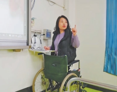 因?yàn)闊o(wú)法行走,王秀穎上課只能依靠輪椅。為了不影響教學(xué),她把輪椅滑到幻燈機(jī)前,跪在輪椅上,找到合適的高度,一邊講解,一邊演算、書(shū)寫。