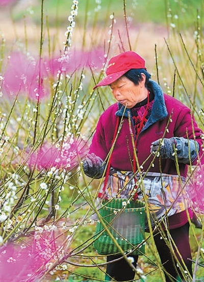 浙江省湖州市長興縣龍山街道的東方梅園內(nèi),梅農(nóng)正在采摘梅花,用于制作梅花香水、梅花精油等產(chǎn)品。