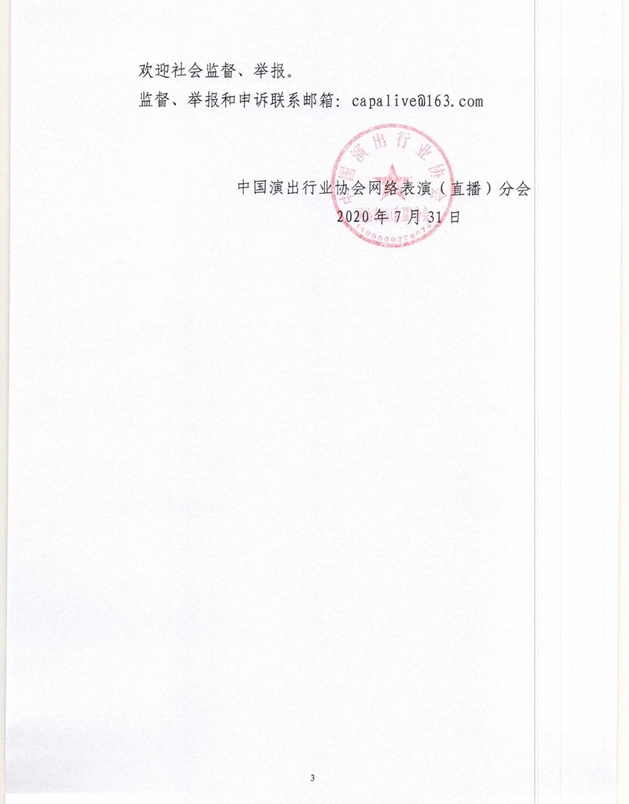 中國(guó)演出行業(yè)協(xié)會(huì)網(wǎng)絡(luò)表演(直播)分會(huì)8月9日發(fā)布: