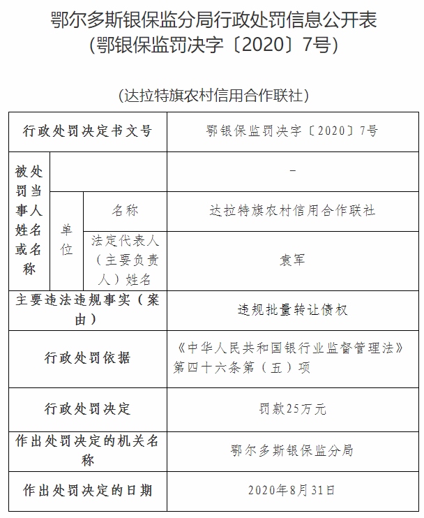 北疆新聞網(wǎng)、北疆新聞客戶端消息(記者 張楊)11月5日,銀保監(jiān)會官網(wǎng)通報達拉特旗農(nóng)村信用合作聯(lián)社違規(guī)批量轉(zhuǎn)讓債權(quán),被鄂爾多斯銀保監(jiān)分局依據(jù)《中華人民共和國銀行業(yè)監(jiān)督管理法》第四十六條第(五)項,處以罰款25萬元。其法定代表人李海淵作為達拉特旗農(nóng)村信用合作聯(lián)社違規(guī)批量轉(zhuǎn)讓債權(quán)的違規(guī)行為直接責(zé)任人,被鄂爾多斯銀保監(jiān)分局依據(jù)《中華人民共和國銀行業(yè)監(jiān)督管理法》第四十八條第一款第(二)項,處以警告處罰。