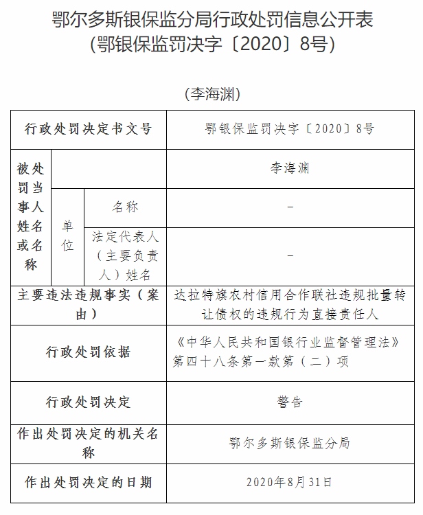 早在2019年11月26日,達拉特旗農(nóng)村信用合作聯(lián)社就曾因存在貸款“三查”制度落實不到位,貸款資金被挪用,被鄂爾多斯銀保監(jiān)分局罰款25萬元。據(jù)了解,達拉特旗農(nóng)村信用合作聯(lián)社因存在貸款“三查”制度落實不到位,貸款資金被挪用的違規(guī)事實,趙新明及楊東負直接責(zé)任。鄂爾多斯銀保監(jiān)分局根據(jù)相關(guān)規(guī)定,對達拉特旗農(nóng)村信用合作聯(lián)社罰款25萬元,對趙新明給予警告處分,楊東被罰終身禁業(yè)。