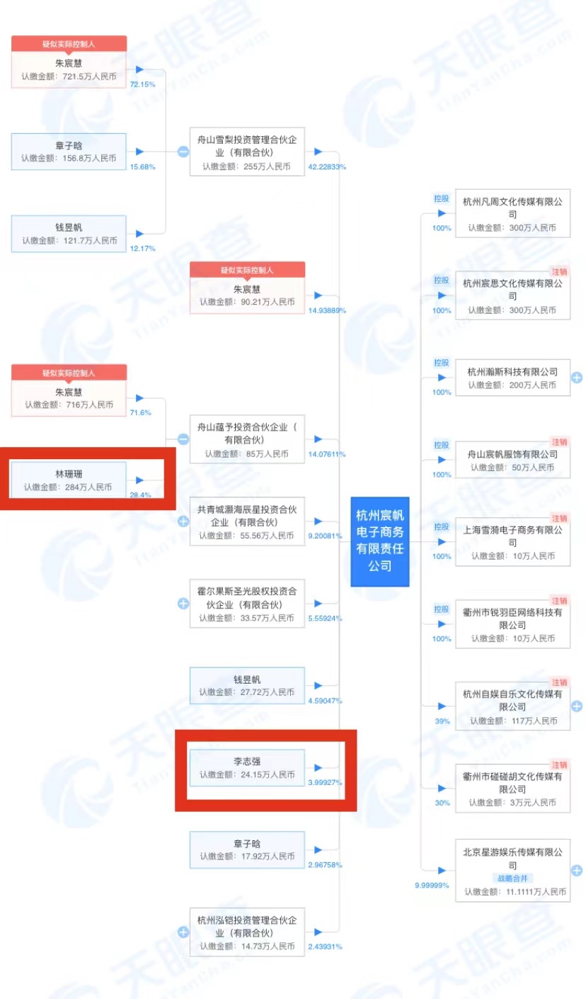 天眼查APP顯示,林珊珊在11家公司任職,其中,與雪梨創(chuàng)辦舟山蘊(yùn)予投資合伙企業(yè)(有限合伙),林珊珊持股28.4%,雪梨持股71.6%,而舟山蘊(yùn)予投資合伙企業(yè)(有限合伙)又是宸帆電商的股東,持股比例約14%。