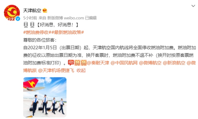今日,中國(guó)國(guó)際航空、海南航空、天津航空、西部航空等多家航空公司發(fā)布通知,根據(jù)國(guó)家發(fā)展改革委、民航局的相關(guān)文件精神,自2022年1月5日零時(shí)起(出票日期),取消征收國(guó)內(nèi)航線燃油附加費(fèi)。