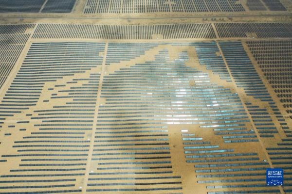 一匹占地130多萬平方米的沙漠“駿馬”橫臥在內(nèi)蒙古自治區(qū)庫布其沙漠之中,這是位于達拉特光伏發(fā)電應用領跑基地中、由近20萬塊光伏板組成的“駿馬電站”。該電站采用“林光互補”模式,板上發(fā)電、板下種植,在開發(fā)利用庫布其沙漠豐富太陽能資源的同時,推動沙漠生態(tài)治理。