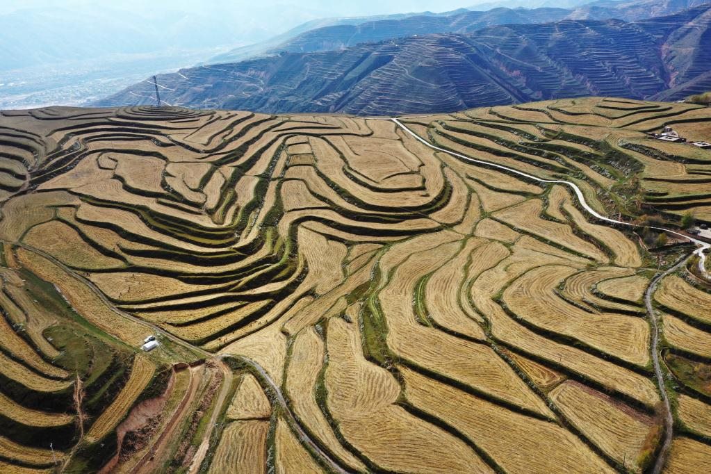 這是10月19日拍攝的青海省黃南藏族自治州同仁市黃乃亥鄉(xiāng)日秀瑪村的燕麥田(無人機照片)。新華社記者 陳杰 攝