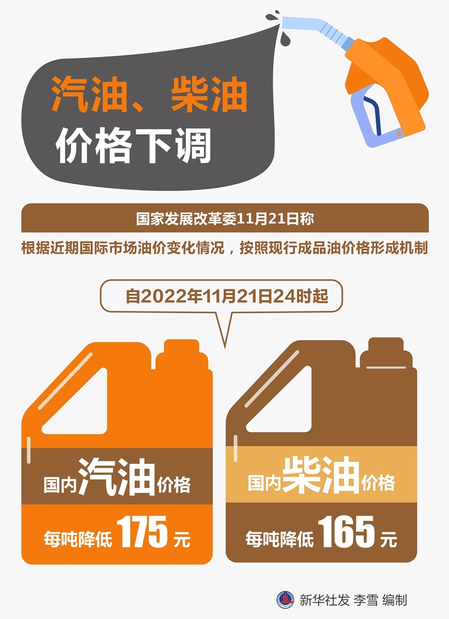 國(guó)家發(fā)展改革委21日稱,根據(jù)近期國(guó)際市場(chǎng)油價(jià)變化情況,按照現(xiàn)行成品油價(jià)格形成機(jī)制,自2022年11月21日24時(shí)起,國(guó)內(nèi)汽油、柴油價(jià)格每噸分別降低175元和165元。