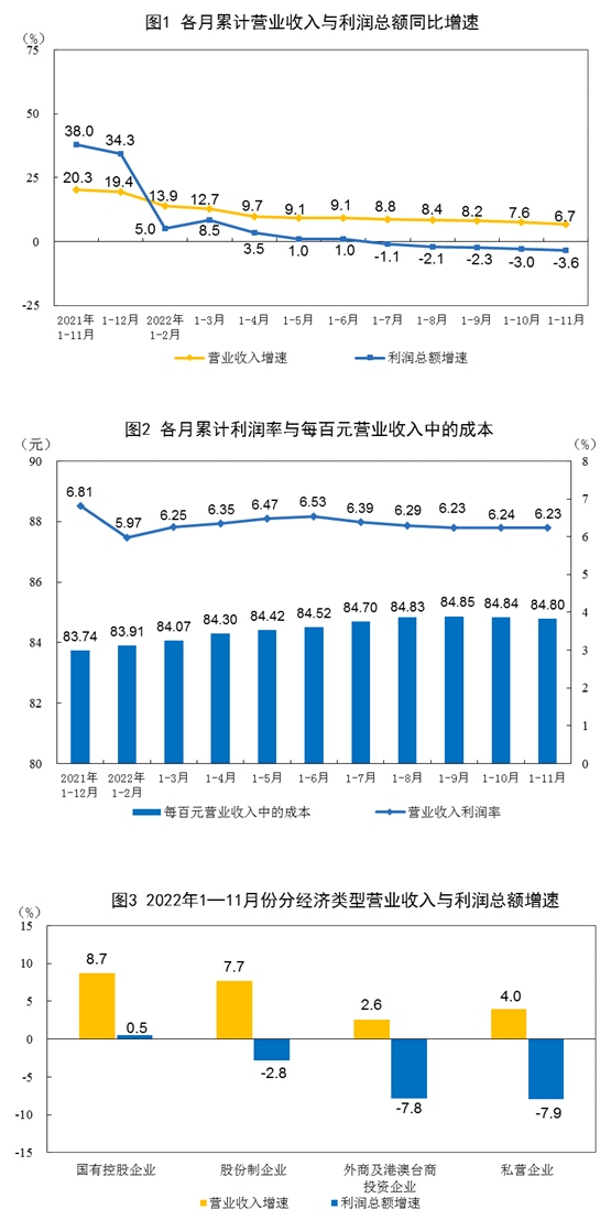 工業(yè)企業(yè)營收保持增長,利潤有所下降。1—11月份,全國規(guī)模以上工業(yè)企業(yè)營業(yè)收入同比增長6.7%,企業(yè)銷售總體保持穩(wěn)定增長。受疫情反彈和需求不足等因素影響,工業(yè)企業(yè)利潤同比下降3.6%,降幅較1—10月份擴大0.6個百分點。個別行業(yè)及少數(shù)重點企業(yè)對工業(yè)企業(yè)利潤下拉影響較大。其中,鋼鐵、石油加工行業(yè)利潤同比降幅較大,兩家疫苗重點企業(yè)由于利潤同期基數(shù)較高,利潤同比大幅減少。剔除上述行業(yè)及企業(yè),其他規(guī)上工業(yè)企業(yè)利潤同比增長6.6%。
