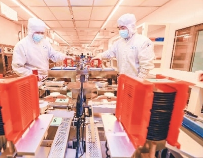 2023年2月16日,在安徽省馬鞍山市經(jīng)濟(jì)開(kāi)發(fā)區(qū)檳城電子有限公司半導(dǎo)體芯片生產(chǎn)線上,職工在趕制應(yīng)用于5G基站上的半導(dǎo)體芯片。王文生攝(人民圖片)