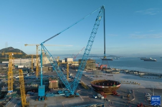這是5月29日拍攝的三門核電二期工程4號(hào)機(jī)組核島鋼制安全殼底封頭吊裝現(xiàn)場(chǎng)。