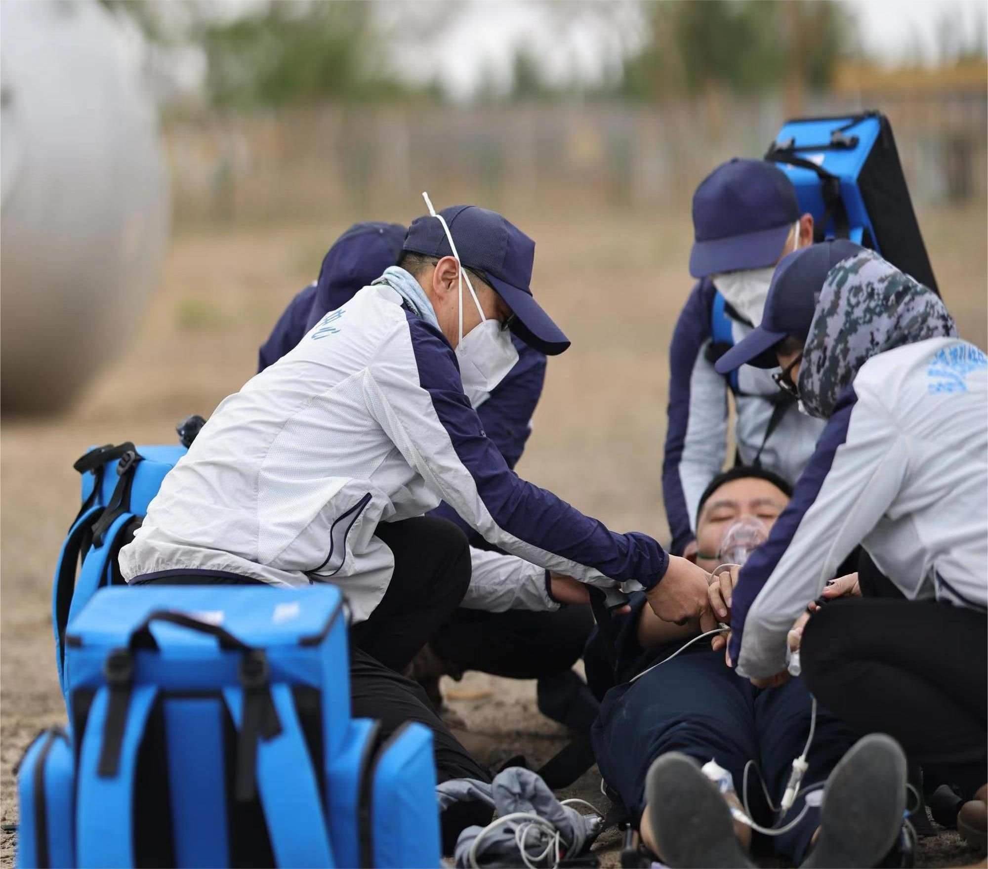 醫(yī)學(xué)急救“白金10分鐘、黃金1小時”,針對可能出現(xiàn)的飛船返回偏離落點,落在沙漠、山地、湖泊,搜救直升機(jī)無法降落,車輛無法進(jìn)入的情況,為快速到達(dá)著陸地點,醫(yī)療救護(hù)隊員每天隨身攜帶艙前急救設(shè)備堅持訓(xùn)練六七個小時,負(fù)重在沙漠、山地中奔跑,爭取最短時間展開緊急救治。夏日戈壁驕陽似火,風(fēng)沙彌漫,訓(xùn)練一天下來,隊員們耳朵眼里都是沙土,臉上脖子全是泥印,一個個都成了泥人。茫茫大草原記錄了神舟載人飛行任務(wù)醫(yī)療隊員們一次次醫(yī)療救護(hù)空地協(xié)同演練、全域協(xié)同演練的身影……