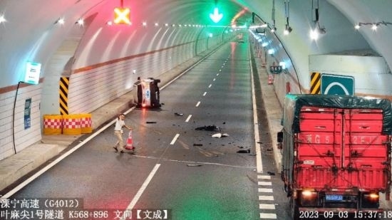 9月3日下午,在G4012溧寧高速葉麻尖隧道內,一輛小車碰撞隧道右側檢修帶,發(fā)生側翻,零部件散落一地。車內3人被困,無法脫身,情況十分危險。1分鐘后,一輛牌照為浙G52FJ2的貨車經(jīng)過,司機李平江師傅見狀,立即把車停在緊急停車帶內,迅速下車并拿起隧道一側的隔離錐放在事故車后,用手勢示意后方來車減速慢行,防止二次事故發(fā)生。