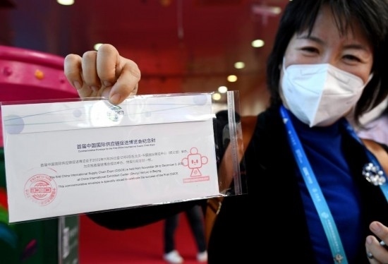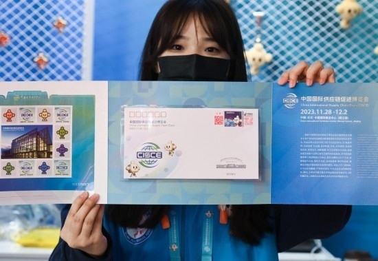 11月29日,一名觀展者在自己購(gòu)買(mǎi)的鏈博會(huì)紀(jì)念郵封上加蓋了帶有“鏈氪”形象的紀(jì)念郵戳。