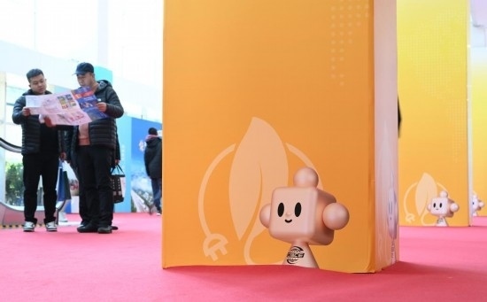 11月29日,鏈博會(huì)會(huì)場(chǎng)入口處的地圖導(dǎo)引墻上印有吉祥物“鏈氪”的形象。